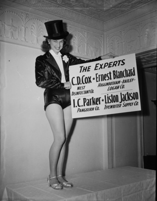 Salesmen from Fort Worth, Texas, and Dallas, Texas, are attending the annual Fall Round-up of the Fort Worth Sales Managers Club at Hotel Texas. Doris Rogers is shown standing on a table, holding a placard listing the names of the speakers at the convention along with their respective companies. Miss Rogers is wearing a top hat, collared blouse, a blazer and shorts. The speakers listed on the placard are C. D. Cox, of West Disinfectant Company, Ernest Blanchard, of Higginbotham-Bailey-Logan Company, I. C. Parker, of Pangburn Company, and Liston Jackson, of Typewriter Supply Company.