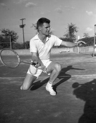 Tennis. Flying Cadet. Alex Guerry of Hicks Field, tennis player, in action shot. Fort Worth Star-Telegram Evening Edition 1941-09-20. Photograph of a young soldier wearing traditional tennis player attire, white pull over shirt with collar, white shorts, and white tennis shoes. He is posed kneeling on one knee and is holding a tennis racket in his right hand, as if he is about to swing it.
