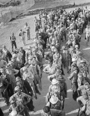 Some of the six-hundred steel workers, in the payoff line at Bomber Plant.