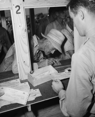 Clifford I. Ladd signing the payroll slip at Bomber Plant.