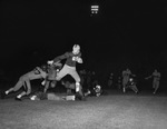 A high school football game between the Polytechnic Parrots and the Bryan Broncos (dark jerseys) is being held at Farrington Field in Fort Worth, Texas. On his first ball carrying effort of the evening, Bronco running back Jim Jackson (69) flew through the Parrot secondary. The shifty 180-pound runner is shown crossing his own thirty en route to the goal line. Whiffing on a knee tackle is Parrot back Kenneth Andrews (77). The Bronco guard lying in the grass is Bill Zak, whose block removed kneeling Weldon Peacock. Jackson is eyeing the approaching safety - Howard Reynolds (85), who he outran after he passed midfield. The play went eighty-yards for a touchdown. In the foreground are three young men in the air and three sprawled on the ground as the rest of the team catches up. In the background are the Friday Night Lights of the ballfield light pole. "(Star-Telegram Photo by Tom Dillard.)" Published Star-Telegram Morn. Sep. 20, 1941.