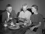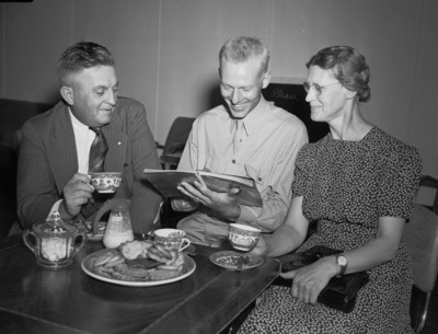 A book of scenic views of Fort Worth, Texas, was of interest to Mr. and Mrs. Frank Fowler, of Minneapolis, Minnesota, who came to Fort Worth, Texas, for a weekend with their son, Wallace Youngquest, 24, a Camp Wolters trainee. They are shown having refreshments and inspecting the book at the United Service Organization (U. S. O.) headquarters in the Bowen Bus Center. The family is seated around a table. Youngquest is sitting in the middle and his father is at left and mother at right. Youngquest is wearing his military uniform and is holding the photo-book. Mr. Fowler is wearing a pinstripe suit and is holding a teacup. Mrs. Fowler is wearing a dress and eyeglasses and is holding her purse in her lap. She has a wristwatch on her left wrist. On the table is a plate of baked goods, a container of sugar cubes and cups and saucers.