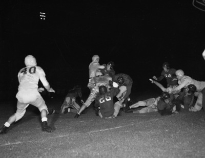 The 1941 college football season is opening at Farrington Field in Fort Worth, Texas. The Texas Wesleyan Rams are hosting the visiting Hardin-Simmons Cowboys (white jerseys). The Rams scored a touchdown early that was called back. Officials ruled backfield motion. The Rams back Johnny Hunter (50) is shown driving low, with the ball. His teammate with his back to the camera is Warren Cohn (26). Sitting on Cohn is Cowboy Floyd Hooten (93). The Rams at the right are Frank Collins (34), Kave King (43) and E. F. Parham (51). "(Star-Telegram Photos by Tom Dillard.)" Published Star-Telegram Morn. Sep. 21, 1941.