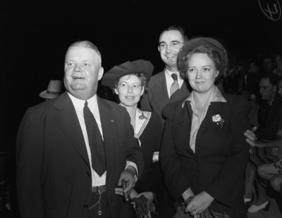 The 1941 college football season is opening at Farrington Field in Fort Worth, Texas. The Texas Wesleyan Rams are hosting the visiting Hardin-Simmons Cowboys. Some 300 West Texas rooters are invading Fort Worth. Attending the game, left to right, are Ed Stewart, Mrs. Stewart, Reverend Philip McGahey and Mrs. McGahey. Mr. Stewart is president of the Abilene Chamber of Commerce. He is dressed in a single-breasted suit, a light shirt, and a tie that matches the suit, a leather belt with a watch chain and fob, a tie tack, and a booster pin in his lapel. He is holding a lit cigar. Mrs. Stewart is wearing a shaped felt hat and a sailor style dress, is holding dark leather gloves and a handbag. Reverend and Mrs. McGahey are from Breckenridge, Texas where he is a Baptist pastor. Reverend McGahey is dressed in a suit with a light shirt and a diagonal design tie, a tie chain, and rimless glasses.. Mrs. McGahey is wearing a hat with netting over the top, a light collared blouse, a wool blazer embellished with brocade, holding a pair of eyeglasses, a pair of gloves, a handbag, and is wearing a wedding ring and an enamel flower brooch. Published Star-Telegram Morn. Sep. 21, 1941.