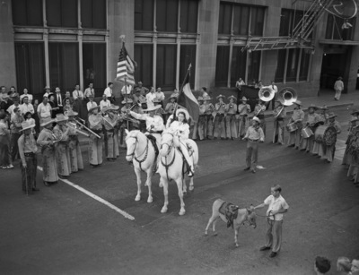The 1941 college football season is opening at Farrington Field in Fort Worth, Texas. The Texas Wesleyan Rams are hosting the visiting Hardin-Simmons Cowboys. Some 300 West Texas rooters are shown invading downtown Fort Worth. The Cowboy Band is forming a semicircle. In the middle, riding on white horses, are Sheriff Will Watson and Miss Gloria Sadler. Sheriff Watson is the sheriff of Abilene, Texas. He is holding an American flag, dressed in a ten gallon hat, button-up shirt, and trousers. Miss Sadler is a student at H. S. U. She is holding a Texas flag, dressed in a hat, collared shirt, trousers, and cowboy boots. Eldon Scroggin is standing at the right with the H. S. U. mascot "Cowboy" - a tiny Palomino mule. There is a man watching from a suspended cover over the doorway on the building behind the activity, next to a set of fire stairs that are pulled up. Published Star-Telegram Morn. Sep. 21, 1941.