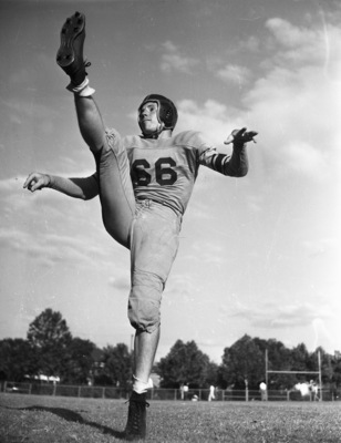 James Dezelle is a triple threat for the Paschal High School football team. The Panther fills an important roll on the team. He passes, punts, and does a lot of fine running for Coach Blanard Spearman. Dezelle was the star of the season opener against Electra High School. He is shown in practice after booting the ball off his right leg. Dezelle is dressed in a number 66 football uniform. The player is wearing knee-length canvas football uniform pants with padded knees, a padded jersey with sleeve stripes and the number 66, wearing a leather helmet, light colored socks and cleated football boots. The background is the grass field, chain link fence around it, and a pipe goal post.