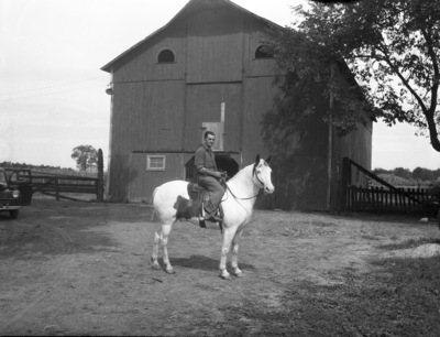 "Tex," is a paint horse from the George Cleveland ranch near Plains, Texas, that the Chuck Wagon Gossiper found working Texas-bred cattle in the feedlots at the Marsh Foundation Farms at Van Wert, Ohio. Tex is the favorite mount of Paul Evans, foreman of the farms, shown on the horse. In the background is a barn. At the far left is an automobile (partially obscured). Evans is wearing a collared shirt and trousers.