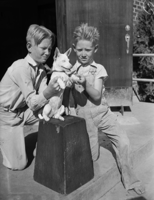 Observance of National Dog Week turned the spotlight on many a pampered Fort Worth canine pet. Here are the five dogs that are rating more than average attention this week. In this picture is "Judy", newly adopted mascot of the Fort Worth Boys Club, being posed by her custodians, Delbert and Charles Jones, brothers. Judy is part Spitz and part unknown. Published in the Fort Worth Star-Telegram evening edition, September 24, 1941.