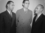 Standing left to right are H. E. Van Ryan, Gordon D. Reath and R. R. Lee, all accountants at Snowden and McSweeney Oil Company. They are standing in front of a bare wall and are all wearing suits. Mr. Reath and Mr. Lee are wearing eyeglasses.