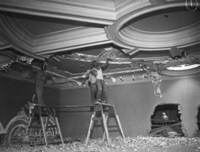 A view of the new room in the Tarrant County Courthouse created by inserting a floor in one of the old high ceilinged courtrooms. Workmen are standing on a wooden scaffold while working on the courtroom ceiling. There are a lot of scraps on the floor from the scraping of the ceiling plaster and walls by the workmen. There is a large hole in the back wall.