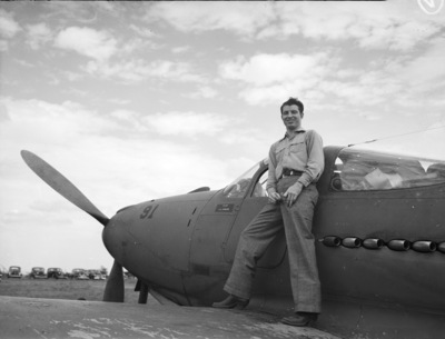 Johnny Van Dyke has been an employee with the Fort Worth Star-Telegram for the past four years. He is the son of Mr. and Mrs. J. L. Van Dyke of Pueblo, Colorado. Johnny recently joined the United States Army. He will report to Kelly Field in San Antonio, Texas, for training as an Air Corps bombardier. Johnny is standing on the wing of airplane, his back against the hatch door. He is dressed in a button-up shirt, trousers, and cowboy boots.