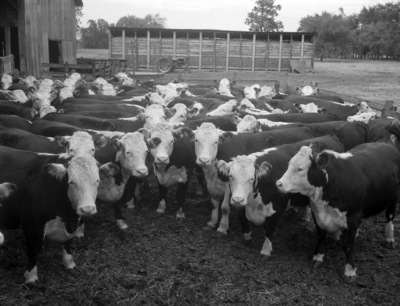 Cattle bred by Raymond Bell, who has ranches in Texas and Mexico, shown in the feedlots of Dwight Hutson at Harrod, Ohio. There is a barn in the background, at left.
