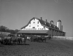 Shot of the barn on Lynnwood Farm, owned by Mr. and Mrs. Charles Lynn, near Carmel, Indiana. Cattle are standing in front of the barn, in a fenced-in area. There is a sign on the barn that reads, "Lynnwood Farm." The farm consists of 622 acres and 47 buildings have been erected on the land from 1934-1941. The farm has a few loads of Shorthorn steers that were bred on the Loving Ranch in Jack County, Texas.
