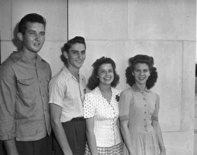 Officers of the June graduating class of North Side High School, left to right, Darwin Burke, Grady Balthrop, Miss Doris McBride and Miss LaVonne Wallis. They are all standing in line and posing for a picture. Published in the Fort Worth Star-Telegram morning edition, September 25, 1941.