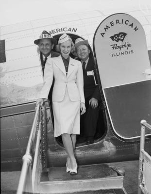 Exiting an American Airlines airplane, left to right, are T. Grover Swift, Miss Sylvia Koskella and Houston Hutchens. Miss Koskella was the flight attendant and Mr. Swift and Mr. Hutchens are two of the 26 members of the North Side Kiwanis Club who flew by chartered plane to Abilene, Texas, for a luncheon meeting to discuss the "good neighbor" policy. Miss Koskella is wearing her flight attendant uniform, made up of a collared blouse and matching blazer and skirt set. Both men are dressed in suits and hats that say "Fort Worth." The airplane door is wide open and printed on the inside of the door is, "American Flagship Illinois," with the airline logo.