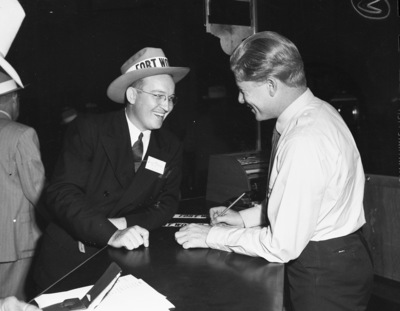 Reverend James N. Morgan, left, is checking that his ticket reservations are in order with Lowell Bryant. Reverend Morgan is leaning over a counter towards Mr. Bryant, who is standing behind the other side of the counter. Mr. Bryant is wearing a long-sleeve shirt, trousers and a tie and Reverend Morgan is wearing a suit, a name tag and a hat that says "Fort Worth." Reverend Morgan is one of the 26 members of the North Side Kiwanis Club who flew by chartered plane to Abilene, Texas, for a luncheon meeting to discuss the "good neighbor" policy.