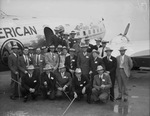 Twenty-six members of the North Side Kiwanis Club, of Fort Worth, Texas, flew to Abilene, Texas, for a luncheon meeting to discuss the "good neighbor," policy. The members are shown standing in front of an American Airlines airplane. They are, left to right, (front row) Jack Edwards, William Fuller, J. A. Lovell, Bradley Burks and Warren Smeby; (center row) T. Grover Swift, Thomas Magoffin, Melvin Miller, Green Trimble, W. L. Pier, Doctor J. H. Thomas, E. F. Crites, W. A. Jordan, A. T. Ward, Jess Prewett, Houston Hutchens, Charles A. Stewart and George Halsell; (back row) J. O. Webster, O. R. Northrip, L. T. Paschall, R. H. Sandsberry, Judge Dave Miller, J. Everett Cline, Reverend James N. Morgan and Police Lieutenant C. T. Stamp. All the members are wearing suits.