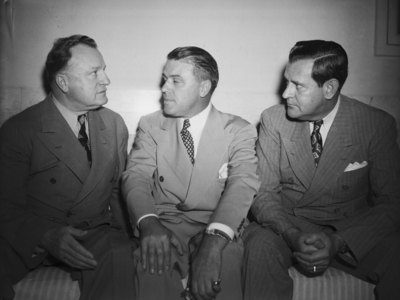Guests at a luncheon at the Fort Worth Club were officials of the Ford Motor Company, left to right, H. C. Doss, general sales manager; C. B. Ostrander, Dallas branch manager and B. W. Slagle, assistant sales manager. The visitors inspected the Lake Worth bomber assembly plant during the afternoon. Ford Motor Company will make the parts that go into the big four motored bombers to be assembled at the Lake Worth plan. They are sitting on a couch and discussing. Published in the Fort Worth Star-Telegram morning edition, September 25, 1941.