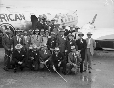 Image shows twenty-six members of the North Side Kiwanis Club, of Fort Worth, Texas, flew to Abilene, Texas, for a luncheon meeting to discuss the "good neighbor," policy. The members are shown standing in front of an American Airlines airplane. They are, left to right, (front row) Jack Edwards, William Fuller, J. A. Lovell, Bradley Burks and Warren Smeby; (center row) T. Grover Swift, Thomas Magoffin, Melvin Miller, Green Trimble, W. L. Pier, Doctor J. H. Thomas, E. F. Crites, W. A. Jordan, A. T. Ward, Jess Prewett, Houston Hutchens, Charles A. Stewart and George Halsell; (back row) J. O. Webster, O. R. Northrip, L. T. Paschall, R. H. Sandsberry, Judge Dave Miller, J. Everett Cline, Reverend James N. Morgan and Police Lieutenant C. T. Stamp. All the members are wearing suits. Published in the Fort Worth Star-Telegram morning edition September 25, 1941.