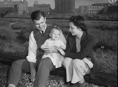 Seven-month-old Linda Day waits with her parents, Mr. and Mrs. W. H. Day, for the arrival of the trains bearing the Ringling Brothers and Barnum and Bailey Circus at the Texas and Pacific Reservation. Mr. and Mrs. Day are sitting on a plank of wood and Linda is sitting on her father's lap. Mrs. Day is wearing trousers, a blouse and a cardigan. Mr. Day is wearing trousers and a v-neck sweater over a collared shirt. Behind them is a grass field and a few tall buildings.