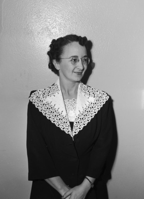 Mrs. A. A. Miller, newly appointed choirmaster of Broadway-Mulkey Methodist Church. She is standing in front of a bare wall and wearing a dress and eyeglasses. Mrs. Miller was choirmaster at the First Methodist Church of Clifton, Texas while Reverend Hayden Edwards, Broadway-Mulkey Methodist Church pastor, was minister there.