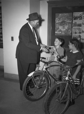First in line to purchase their bicycle license for 1942 are Carol Janet Greene (right) and Viki Williams (center). E. E. Lockard (left) is placing the new licenses on the children's bicycles. Mr. Lockard is the officer in charge of license sales at the Fort Worth, Texas, city hall. He is wearing a hat and a double breasted suit. Carol Janet is the 8-year-old daughter of Mr. and Mrs. A. B. Greene. She is wearing a polka-dot dress with a Peter Pan collar. Viki is 8-year-old son of Mr. and Mrs. J. B. Williams. He is dressed in a button-up shirt and striped trousers. Behind them is a bulletin board with a poster promoting bicycling safety.
