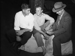 The University of Texas football team briefly stopped in Fort Worth, Texas en route to the Rockies for their opening game game against the University of Colorado. The Longhorn high command is going over the game plan. They are,left to right, Pete Layden, Jack Crain and Coach Dana X. Bible. Layden is the team captain. He is dressed in a button-up shirt and trousers. Crain is awake from a nap and still barefooted. He is wearing a striped shirt and trousers. Coach Bible is pondering a new play and discussing it with the players. He is dressed in a hat and a suit. Published in the Fort Worth Star-Telegram morning edition, September 25, 1941.