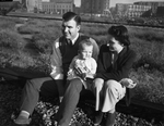 Image shows Seven-month-old Linda Day waits with her parents, Mr. and Mrs. W. H. Day, for the arrival of the trains bearing the Ringling Brothers and Barnum and Bailey Circus at the Texas and Pacific Reservation. Mr. and Mrs. Day are sitting on a plank of wood and Linda is sitting on her father's lap. Mrs. Day is wearing trousers, a blouse and a cardigan. Mr. Day is wearing trousers and a V-neck sweater over a collared shirt. Behind them is a grass field and a few tall buildings. Published in the Fort Worth Star-Telegram evening edition September 25, 1941.