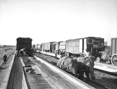 Image shows Shot of the unloading proceedings as the Ringling Brothers and Barnum and Bailey Circus set up for a one-day stand in Fort Worth, Texas. They will have performances at the Texas and Pacific Reservation. Off the railway tracks are two elephants. An unidentified man is riding atop one of the elephants. On both sides of the animals there are train carts that read, "Ringling Brothers." Published in the Fort Worth Star-Telegram evening edition September 25, 1941.