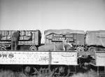 Image shows Shot of the unloading proceedings as the Ringling Brothers and Barnum and Bailey Circus set up for a one-day stand in Fort Worth, Texas. They will have performances at the Texas and Pacific Reservation. In center of the railway tracks are two elephants. An unidentified man is riding atop one of the elephants. On both sides of the animals there are train carts that read, "Ringling Brothers." Published in the Fort Worth Star-Telegram evening edition September 25, 1941.