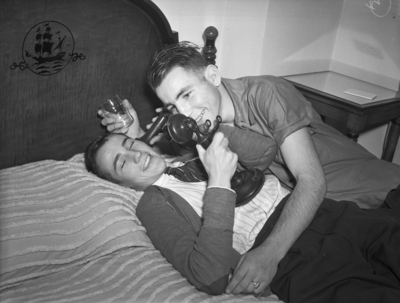 Amateur boxers from all over the state are in Fort Worth, Texas for the Golden Gloves state tournament. Two Dallas representatives are shown goofing off before their Friday night fights. They are left to right Buddy Cole and Allen McCorvey. Cole, a flyweight, is holding a telephone, attempting to call his girlfriend in Dallas, Texas. He is being bothered by the lightweight McCorvey and a full glass of water. Cole is wearing a dress shirt, neck tie, sweater, and trousers. McCorvey is dressed in a button-up shirt and trousers.