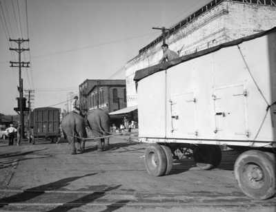 Image shows Shot of the unloading proceedings as the Ringling Brothers and Barnum and Bailey Circus set up for a one-day stand in Fort Worth, Texas. They will have performances at the Texas and Pacific Reservation. . An unidentified man is riding atop one of the elephants through the middle of a street. On right is a truck full of unidentified people. Published in the Fort Worth Star-Telegram evening edition September 25, 1941.