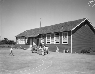 Worth Heights Elementary school, one of three schools recommended for closing as an economy measure in Fort Worth ISD by Dr. Guy Fowlkes, education professor of the University of Wisconsin, 09/26/1941. Children are seen with a teacher standing outside on the school's premises in front of the building. There are circular chalk marks on the ground.