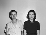 Left to right, Abney Cooper and Miss Alice Marie Shannon, who are new vice president and president, respectively, of the Young People's Fellowship of Saint Andrew's Episcopal Church. They are standing in front of a bare wall. Mr. Cooper is wearing a collared shirt and Miss Shannon is wearing a dress with a brooch pinned on the center of the collar.