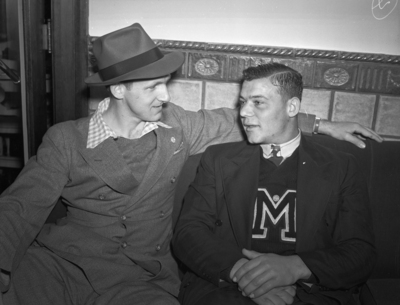 Amateur boxers from all over Texas are in Fort Worth for the Golden Gloves state tournament. Two heavyweights are having a conference in the hotel lobby, They are left to right T. B. Connell and Aubrey "Fatty" Martin. Connell is a blonde puncher from Tyler, Texas. He is dressed in a hat, collared shirt, sweater, double breasted blazer, and trousers. Martin is the roughhouse Milford, Texas kid, who won the Fort Worth district title. He is wearing a dress shirt, necktie, sweater with an "M" stitched on the front, and a blazer.