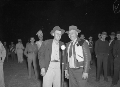 Singers at the Electra, Texas Chuck Wagon Feed are Clifford Gage, left, and W. L. Gassity, Electra, Texas. The men are standing in front of a microphone.The dinner is sponsored by the oil bureau of the Electra Chamber of Commerce. This photograph was published in the September 28, 1941 morning edition of the Star-Telegram.