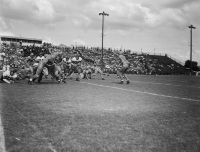 Burrus, H. C.; Crain, Milton; Gatewood, Lester; Hardin-Simmons University; Hardin-Simmons Cowboys; Football; Football players; Football Uniforms; Helmets; Football Fields; Football Stadiums; Crowds; Grandstands; Waco Municipal Stadium; tuba