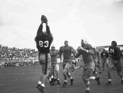 The Texas Christian University Horned Frogs are hosting the visiting University of Tulsa Hurricanes. The game opens the football season at Amon G. Carter Stadium in Fort Worth, Texas. During the game, talented young end Bruce Alford (83) made his presence known. He is shown leaping in the air, yanking the football from his opponent's grasp. The Frogs went on to win the game 6-0. Published in Fort Worth Star-Telegram.