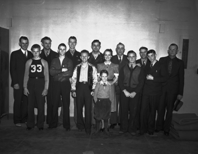 Fort Worth, Texas is hosting the state Golden Gloves tournament at the Will Rogers Memorial Coliseum. Representing the Follett Delegation back row, left to right are Glen Frazier, Henry Haines, Harry Davidson, Leroy Davis, J. A. Gex, Doc Jones, and O. J. Gross. On the front row, left to right are Bill Joe Rode, Taylor Miller, Benny Moore, Miss Sydna Yokley, Buddy Gross, Glenden Elmore, and Bud Yount. Miss Yokley is a famous ranch girl from Canada. She is attending school at Texas Christian University.