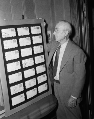 C. M. Love is the president of the Panther City Philatelic Society. He is standing with his collection of South American air mail covers. Mr. Love is one of the first members to reserve space for the exhibit at the Blackstone Hotel. He is dressed in a suit and eyeglasses.