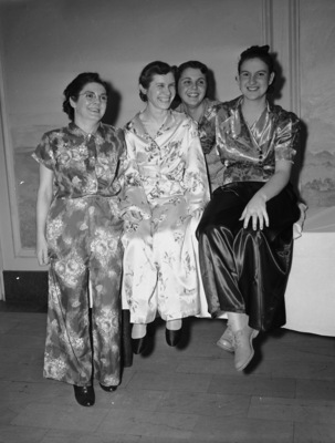 They had reverted to typewriters and street clothes Tuesday, after the two-day Texas-Shreveport conference of Young Women's Christian Association (Y.W.C.A.) business girls last weekend at Hotel Texas, A highlight of which was the pajama party, where the above picture was taken. Left to right, Misses Hazel Black, Fort Worth; Mattie Herzog, Waco; Helen Tandy, Fort Worth' and Georgette Petifils, Galveston. The young women smile in their pajamas.