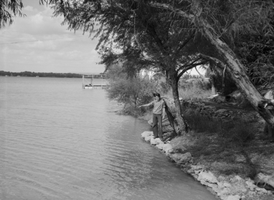 Image of Barry McCoy Jr., 15, of Lake Worth, who recovered the body of Diane Neil, 4, from the lake and attempted to save her life by artificial respiration is shown, pointing to the area where he had found her. Published in Fort Worth Star-Telegram morning edition September 28, 1941.