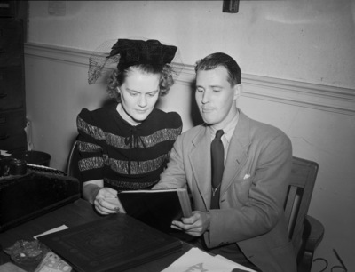 Director Howard Chandler Dilley, right, and Mrs. Bert K. Smith Junior, left, general chairperson, planning for the Junior League Jamboree at Pioneer Palace, October 16-18. Dilley is from the Jerome H. Cargill Theatrical Agency of New York. They are sitting at a desk. Mr. Dilley is weqring a suit and Mrs. Smith is wering a striped blouse and a hat with a veil.