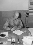 Brigadier General William Hood Simpson is the commander of Camp Wolters Infantry Replacement Center at Mineral Wells, Texas. He is being nominated by President Franklin D. Roosevelt for promotion to Major General. General Simpson is sitting at his desk signing a document. He is dressed in his military uniform. Published in Fort Worth Star-Telegram, morning edition, September 30, 1941.