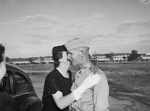 Brigadier General William Hood Simpson is the commander of Camp Wolters Infantry Replacement Center at Mineral Wells, Texas. He is being nominated by President Franklin D. Roosevelt for promotion to Major General. Congratulating General Simpson is his wife, Mrs. Simpson. She is wearing a hat, dress, pearl necklace, and gloves. General Simpson is dressed in his military uniform. There is an automobile parked behind them. Published in Fort Worth Star-Telegram, morning edition, September 30, 1941.