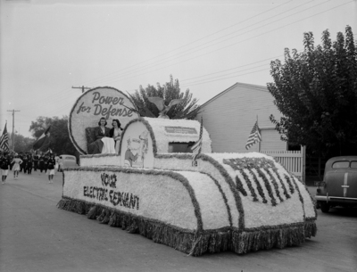 Colorful was the word for floats entered in the parade that opened the nineteenth annual West Texas Fair at Abilene. The patriotic-national defense theme was dominant. In this picture is West Texas Utilities Company's float. There are two girls sitting on the float. Published in the Fort Worth Star-Telegram, September 30, 1941.