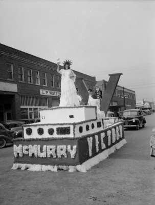 Colorful was the word for floats entered in the parade that opened the nineteenth annual West Texas Fair at Abilene. The patriotic-national defense theme was dominant. In this picture is McMurry College's float, which tied with that of Abilene Christian College for third prize. Published in the Fort Worth Star-Telegram, September 30, 1941.