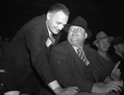 Sports editors and district directors from all over the state of Texas are in Fort Worth for the Golden Gloves State Tournament. Attending the fights at Will Rogers Memorial Coliseum from left to right are Roger Busfield and Bill Scurlock. Mr. Busfield is from Austin, Texas. He is dressed in a pinstripe suit. Mr. Scurlock, of Beaumont, Texas, is wearing a hat and a three piece suit. A crowd of people are sitting around the men.