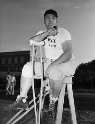 Luther Scarborough is the coach of the Polytechnic High School football team. He is the winner of the prize given to the first coaching casualty of the season. He was attempting to demonstrate a play when he hurt his knee in practice. The injury didn't hold Coach Scarborough back long. He is shown sitting on a stool with crutches as he observes practice. He is dressed in a t-shirt, trousers, sneakers, and a baseball cap. "(Star-Telegram Photo.)" Published Star-Telegram Morn. Oct. 1, 1941.