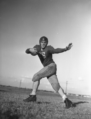 Warren Cohn is a football player at Texas Wesleyan College. He has missed two of the Rams' first three games with an illness. On the mend and looking good in practice, Cohn plans to play in the upcoming game with Howard Payne in Brownwood, Texas. Cohn is a transfer student from Allen Academy. He plays both wing back and fullback for the Rams. He is shown running the ball and practicing his stiff arm. He is dressed in a number 26 football uniform and a helmet. Published Star-Telegram Eve. Oct. 31, 1941.